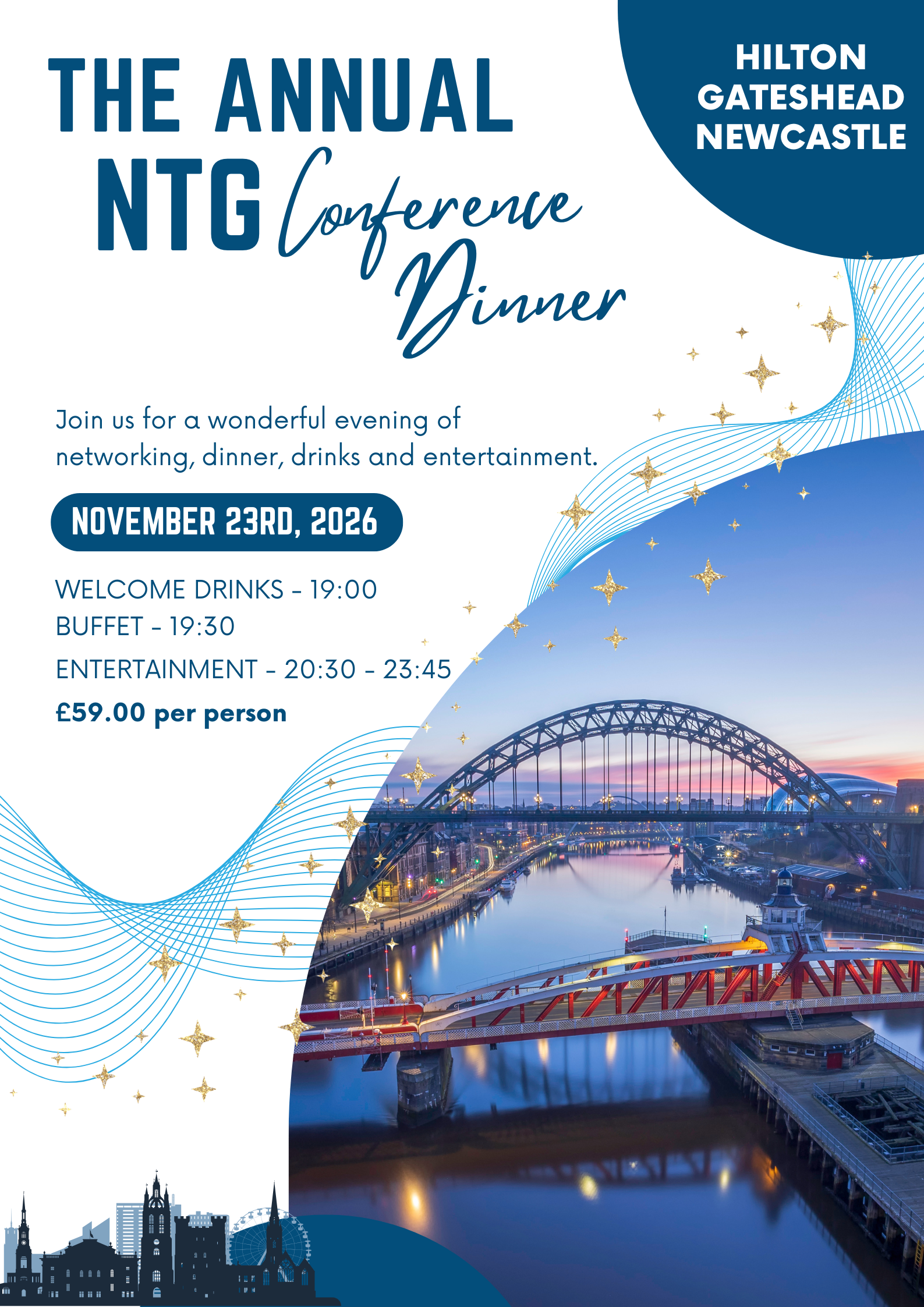 We'd love to see you at this year's conference dinner. You can book your tickets during registration. Welcome drinks will take place from 19:00 -19:30 in the Gateshead Suite. With a Buffet and entertainment to follow from 19:30 - 23:45.