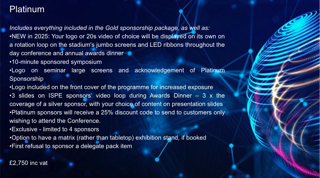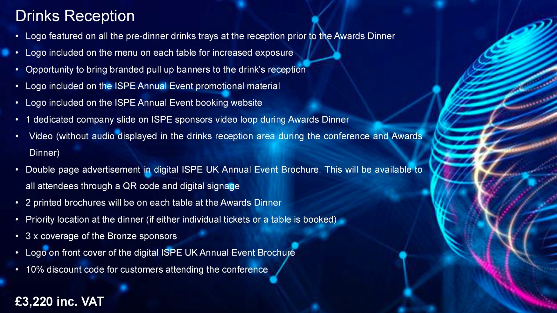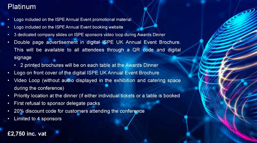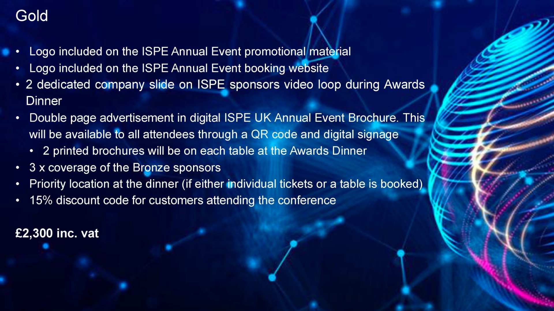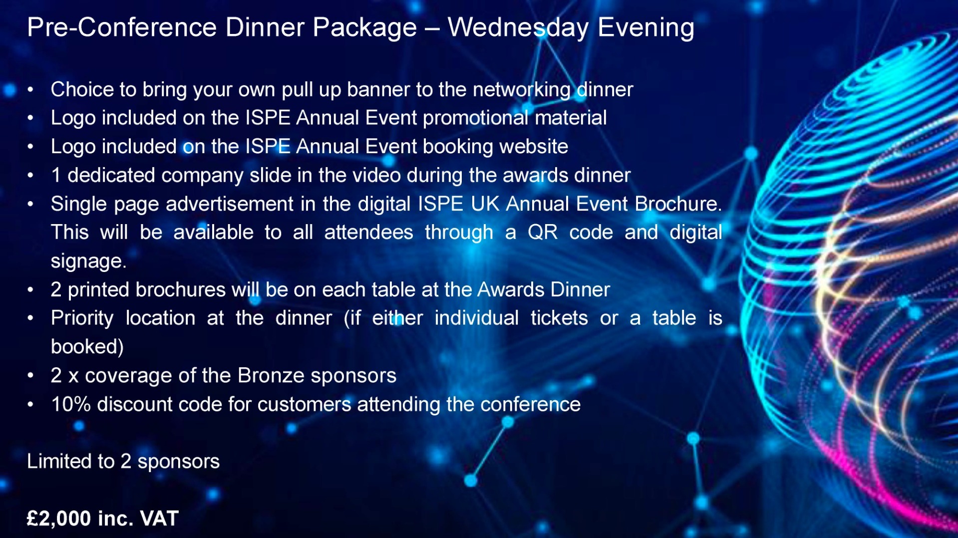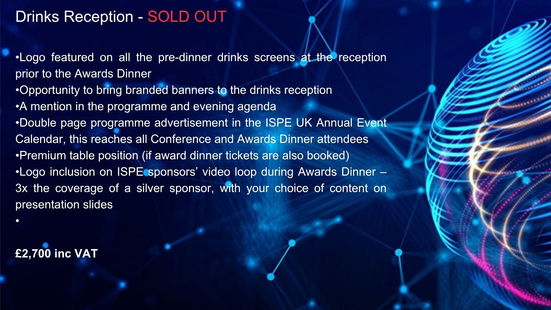 Please note that the exhibition stand, dinner tickets or conference tickets are NOT included in the sponsorship packages. These will need to be purchased separately.
