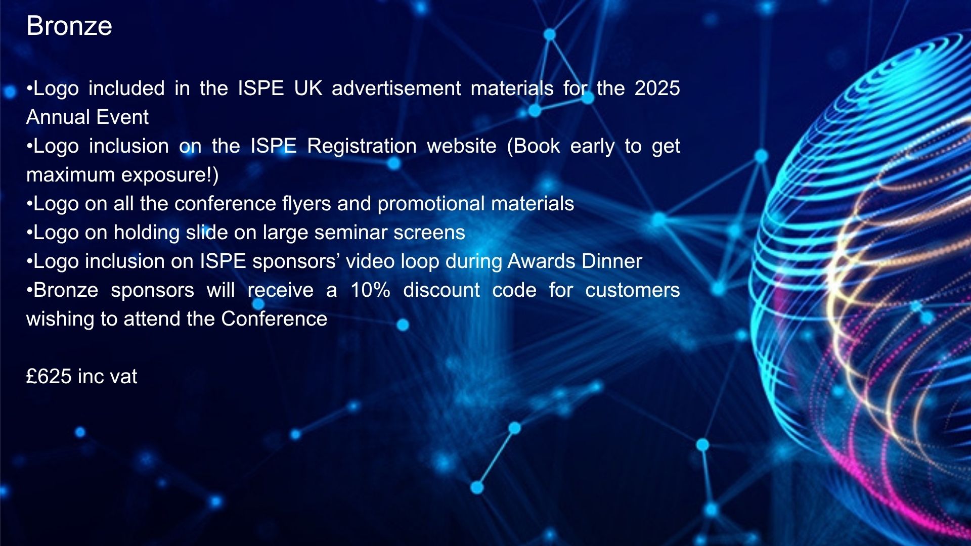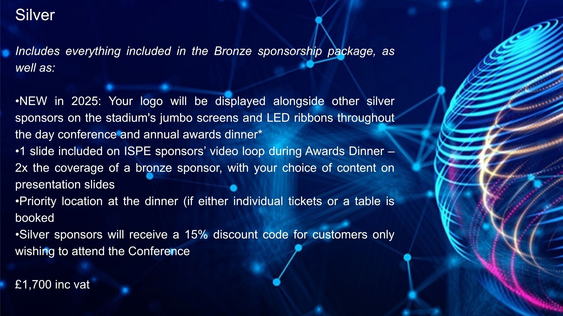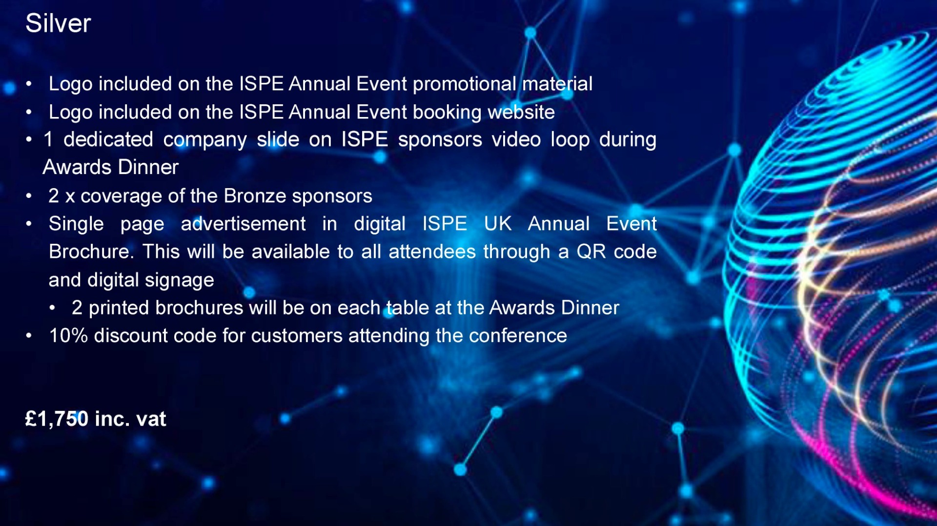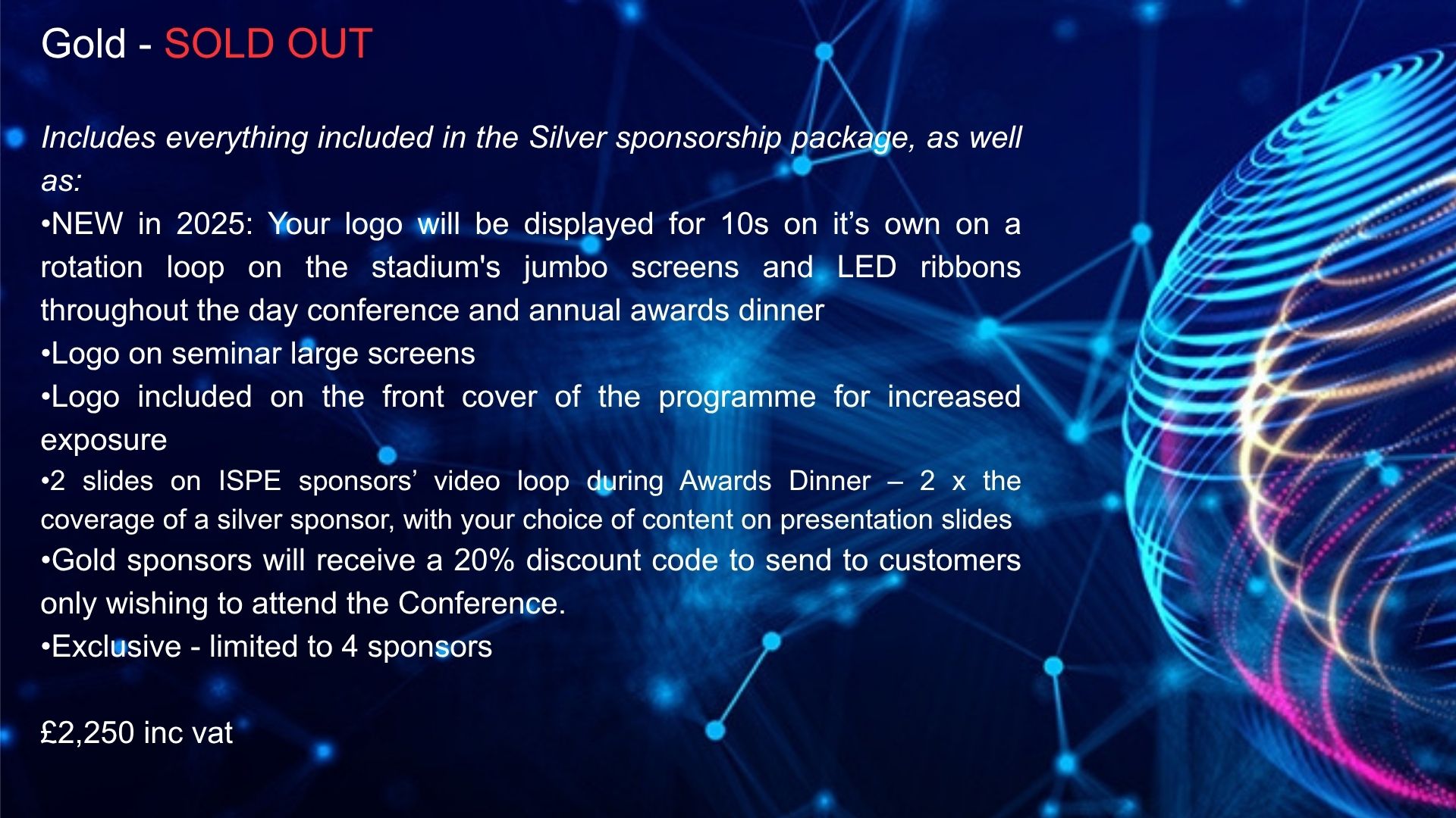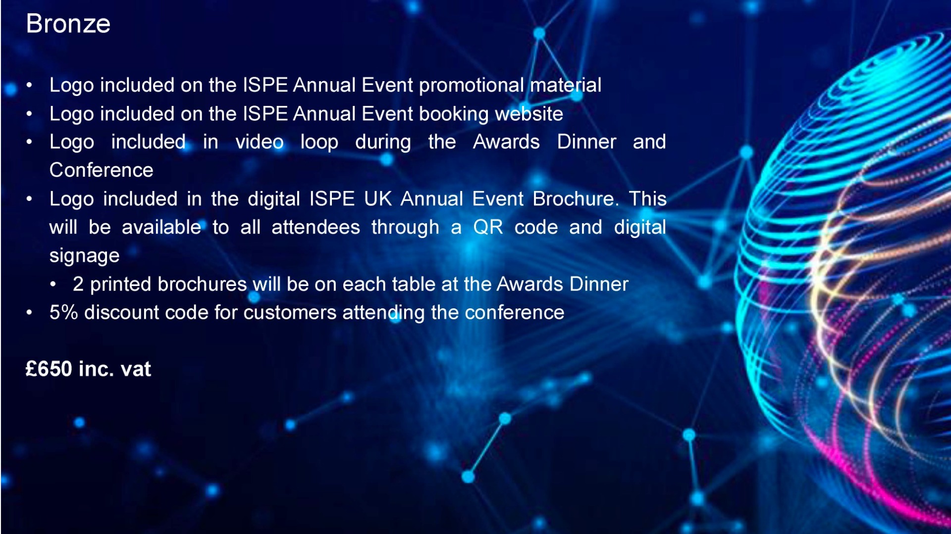 Please note that the exhibition stand, dinner tickets or conference tickets are NOT included in the sponsorship packages. These will need to be purchased separately.